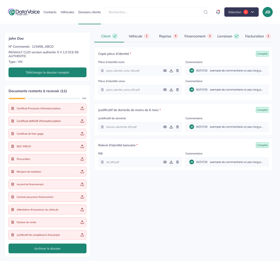 Le module Dossier Client d’eData Voice permet une gestion entièrement numérique des éléments essentiels d’une transaction neuf ou occasion :